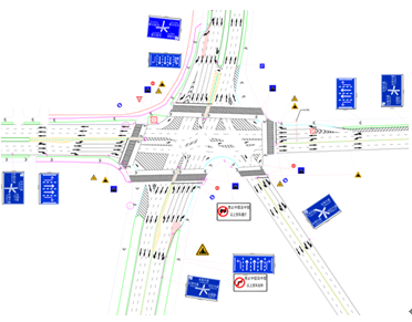 交叉口内部区域采用导流线、行人过街安全岛以及交通流向标志标识等进行渠划设计。