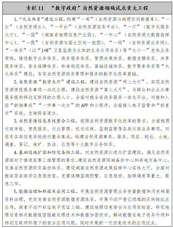 ——自然资源领域“数字政府”基本完成。全面推动自然资源工作数字化转型,基本实现改革系统化、资源数据化、业务标准化、审批平台化、应用网络化、服务便捷化目标,力争成为全国自然资源系统“数字政府”建设标杆。
